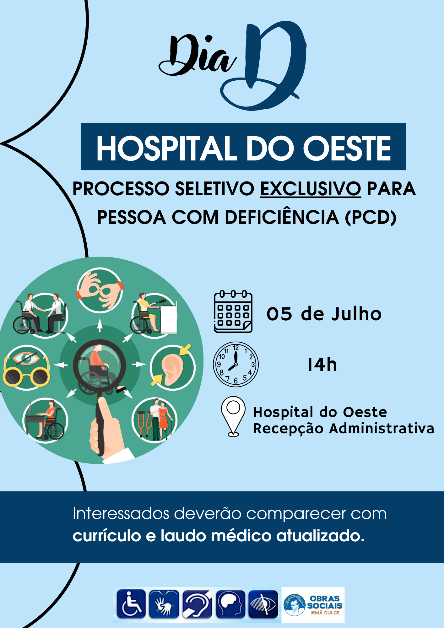 Processo seletivo exclusivo – No dia 05 de julho as 14h será realizado o “Mutirão Dia D”, para contratação na categoria PCD. Para participar  é necessário comparecer na recepção administrativa do hospital com currículo e laudo médico atualizado.