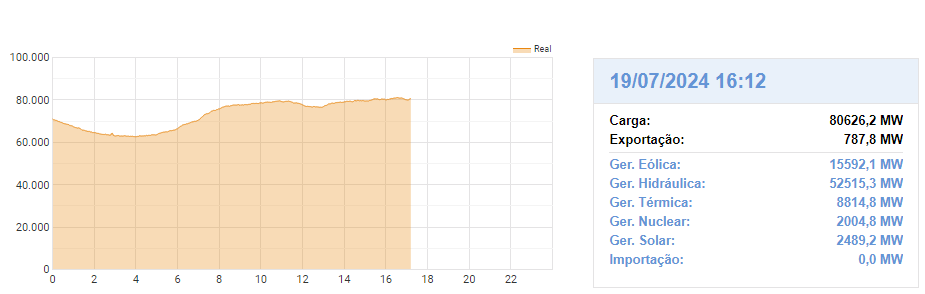 Neste momento, o Sistema Nacional consumia pouco mais de 80 gigawatts, com a energia eólica responsável por pouco mais de 15,5 gigawatts. Abra a imagem em uma nova guia. Como referência, temos a geração de Itaipu, com potência nominal de 14 gigawatts.