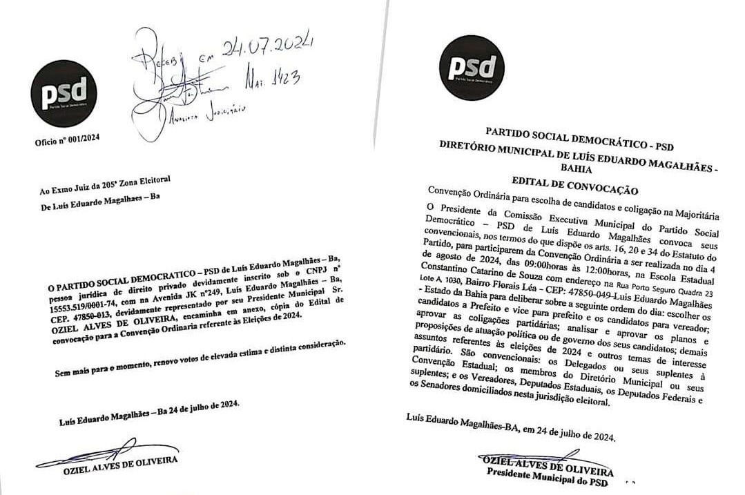 O Partido Social Democrático – PSD protocolou o Edital de Convocação para a Convenção Ordinária referente às Eleições de 2024, em Luís Eduardo Magalhães, após grandes especulações sobre a candidatura do ex-prefeito Oziel Oliveira (PSD).