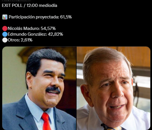 De acordo com a Hinterlaces, Edmundo González Urrutia, candidato da oposição pelo Plataforma Unitária, ficará em segundo lugar, com 42,82%.