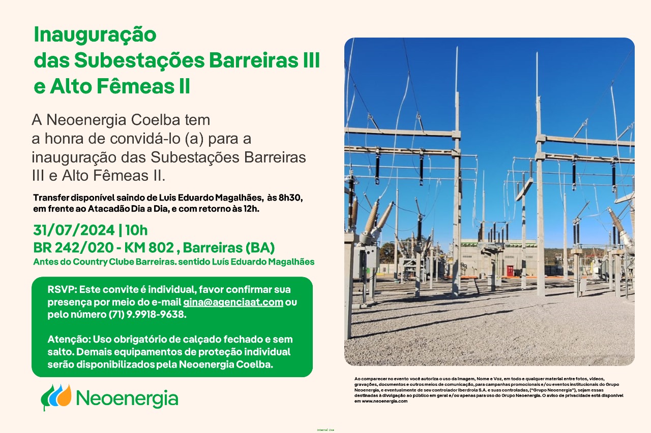 A Neoenergia está convidando para participar do evento de inauguração de duas novas subestações da Neoenergia Coelba no Oeste Baiano – Barreiras III e Alto Fêmeas II, empreendimentos que vão impulsionar ainda mais o desenvolvimento econômico e social da região, com investimento de mais de R$ 150 milhões, ampliação em mais de 25 MVA na oferta de energia e impacto positivo em mais de 200 mil habitantes.