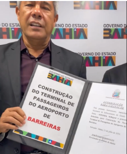 “Olá, Barreiras! Boa novidade! Eu acabei de assinar aqui, e estará publicado no Diário Oficial de quinta-feira, 1º de agosto, a licitação para a construção, ampliação e modernização do terminal de passageiros e do estacionamento do aeroporto. A obra é de R$ 25 milhões, quase quatro vezes a área do TPS e o estacionamento está saindo de 100 veículos para quase 200, dobrando a capacidade. Esta é uma parceria com o presidente Lula e com diversos segmentos da sociedade de Barreiras. Além disso, estamos comprometidos com a ampliação da pista do aeroporto,” afirmou o governador.