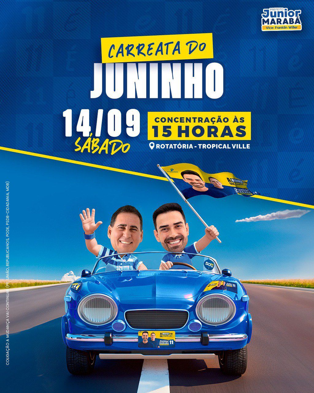 Neste sábado (14/09), o atual prefeito e candidato a reeleição de Luis Eduardo Magalhães, ao lado do candidato a vice Franklin Willer e demais vereadores da Coligação “a Mudança Vai Continuar” promoverão a “Carreata do Juninho”.