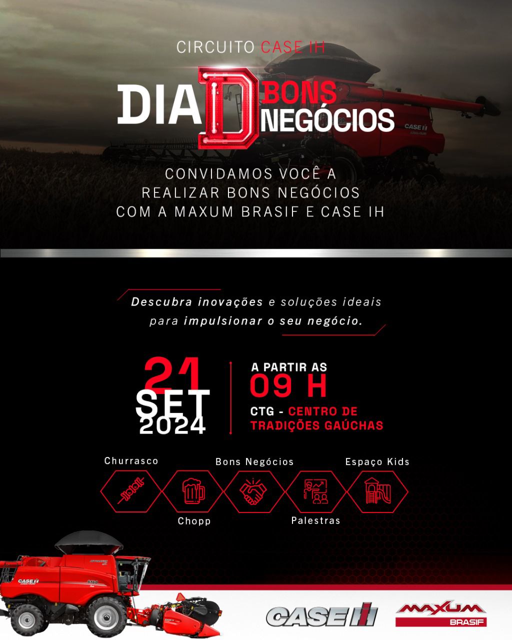 A Maxum Brasif, nova empresa do grupo Empresas Brasif, realiza no dia 21 de setembro, o Dia D de Bons Negócios, evento tradicional do setor, onde os clientes das máquinas Case Agrícola terão a oportunidade de negociar equipamentos, peças e serviços em condições diferenciadas e ter contato direto com especialistas da fábrica, apresentando as melhores formas de funcionamento e manutenção. Outro destaque do evento serão as palestras técnicas realizadas por especialistas da Bosch e da Rural Clima, falando sobre plantabilidade e Agrometeorologia, temas que podem evitar perdas e aumentar a produtividade, especialmente de lavouras de soja e milho.