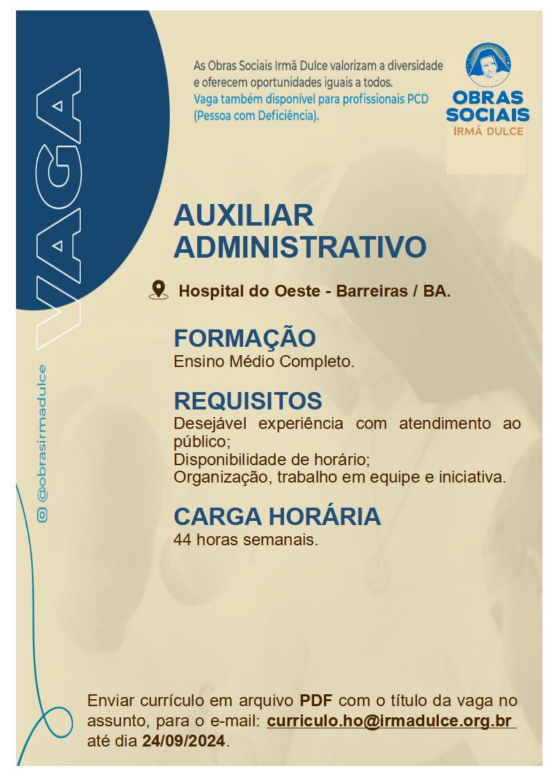 O Hospital do Oeste (HO), unidade vinculada ao governo estadual e administrada pelas Obras Sociais Irmã Dulce (OSID) no município de Barreiras divulga as vagas de fisioterapeuta, enfermeiro principal, auxiliar administrativo, auxiliar de manutenção, auxiliar de serviços gerais, bolsista fisioterapia, bolsista técnico de enfermagem, bolsista técnico em eletrônica, maqueiro e operador de máquinas.