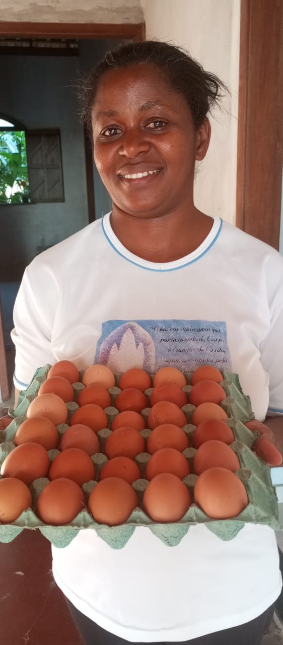 Outro resultado positivo, a partir da criação de aves, é o de Dileusa Sousa Silva Costa, da Comunidade de Cova da Negra, em Castro Alves, que agarrou a oportunidade, dobrou a quantidade de aves, de 25 para 50, e já colhe os frutos desse trabalho: duas dúzias de ovos por dia, viabilizando a comercialização e, consequentemente, a renda.