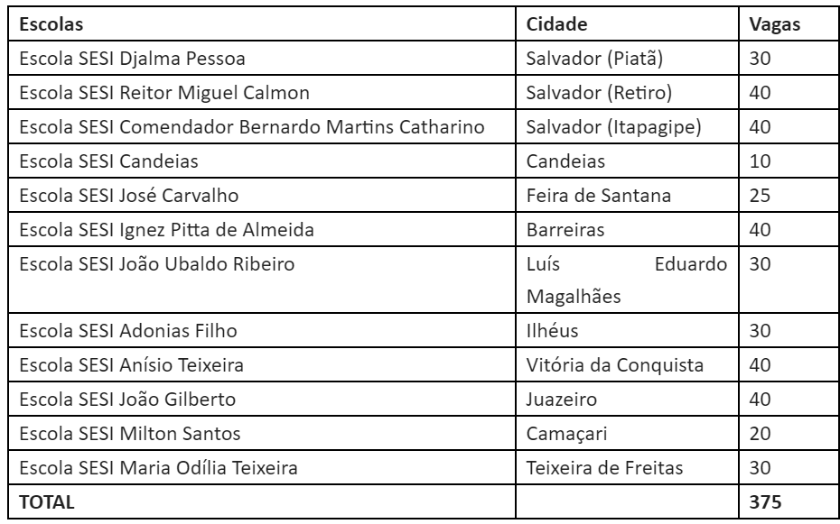 As vagas serão exclusivas para ingresso na Formação Técnica e Profissional e para estudantes com renda familiar líquida familiar de até 2,5 (dois e meio) salários mínimos. Estão incluídas no processo seletivo as 12 escolas da Rede SESI em toda a Bahia, localizadas em Salvador e Região Metropolitana e no interior (ver quadro abaixo).