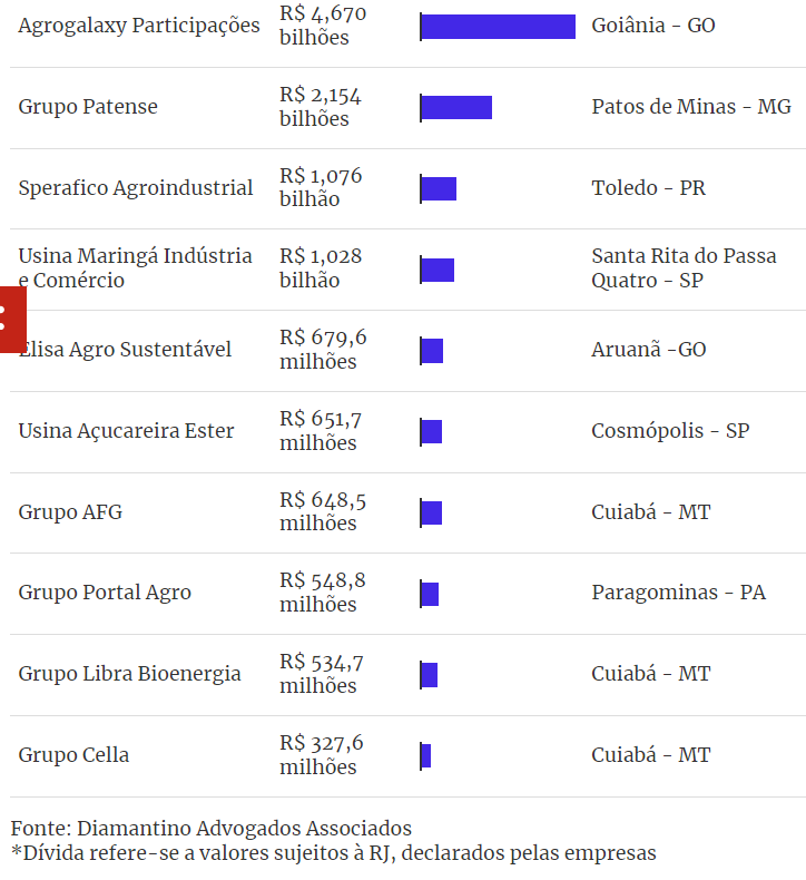 Elaborado para o Metrópoles pelo escritório Diamantino Advogados Associados, especializado no setor, o ranking (veja quadro abaixo) inclui outras RJs pesadas deste ano. Nesse caso, estão o processo do Grupo Patense, de Patos de Minas (MG), que processa resíduos de origem animal para fabricação de rações, óleo para a indústria de higiene e limpeza e biocombustíveis, e da Elisa Agro, de Aruanã (GO), uma das maiores empresas de agricultura irrigada do país.