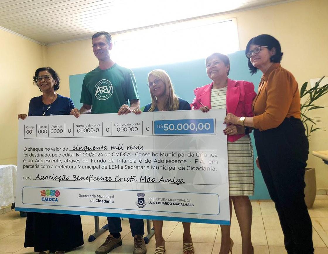 O Conselho Municipal da Criança e do Adolescente de Luís Eduardo Magalhães (CMDCA) realizou a entrega dos cheques simbólicos no valor de R$ 50 mil, cada, para oito instituições na manhã da última sexta-feira, 11 de outubro, véspera do feriado de Nossa Senhora Aparecida e também dia das crianças. Na oportunidade foi assinado o termo de fomento com o município.