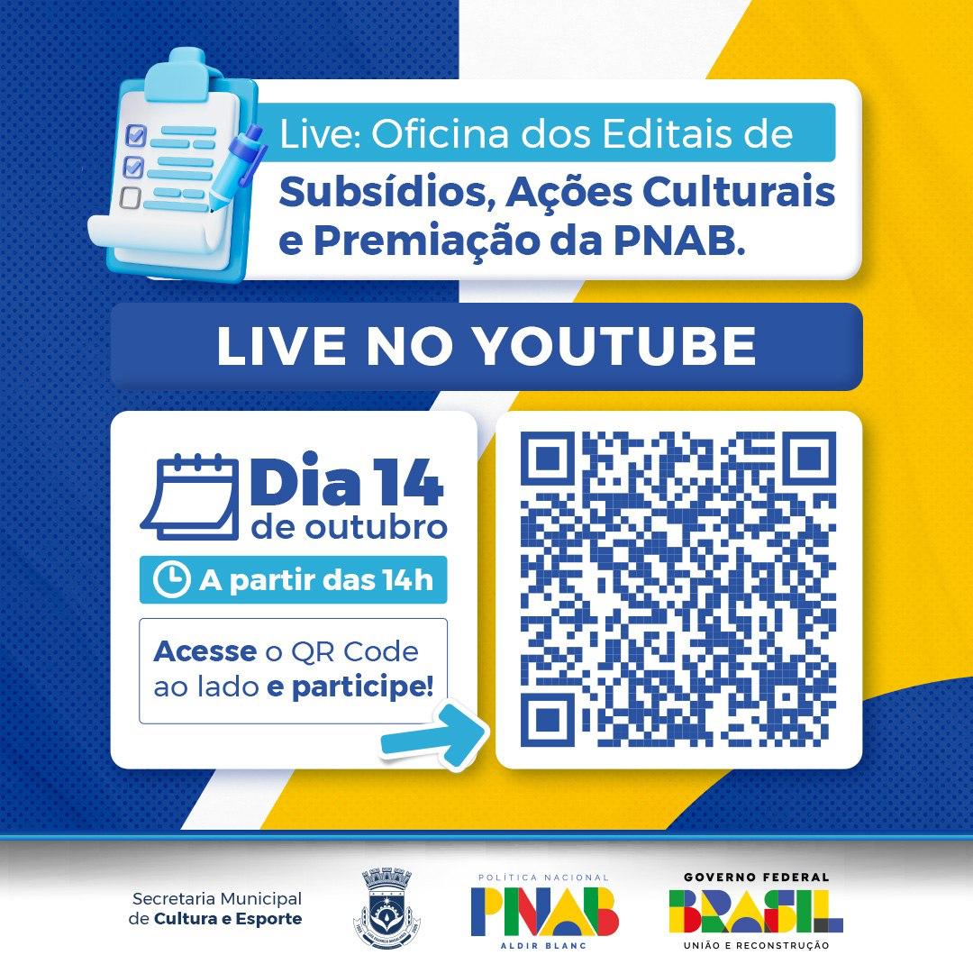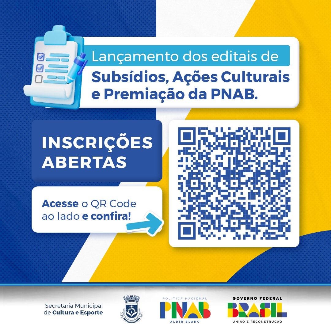 A Secretaria Municipal de Cultura e Esportes de Luís Eduardo Magalhães, torna público, que estão abertas as inscrições até o dia 21 de outubro, para três editais da Política Nacional Aldir Blanc de Fomento à Cultura (PNAB). Os chamamentos foram publicados no diário oficial do município do último dia 08 de outubro. Editais completos disponíveis no link: https://www.luiseduardomagalhaes.ba.gov.br/aldir-blanc-2024/.