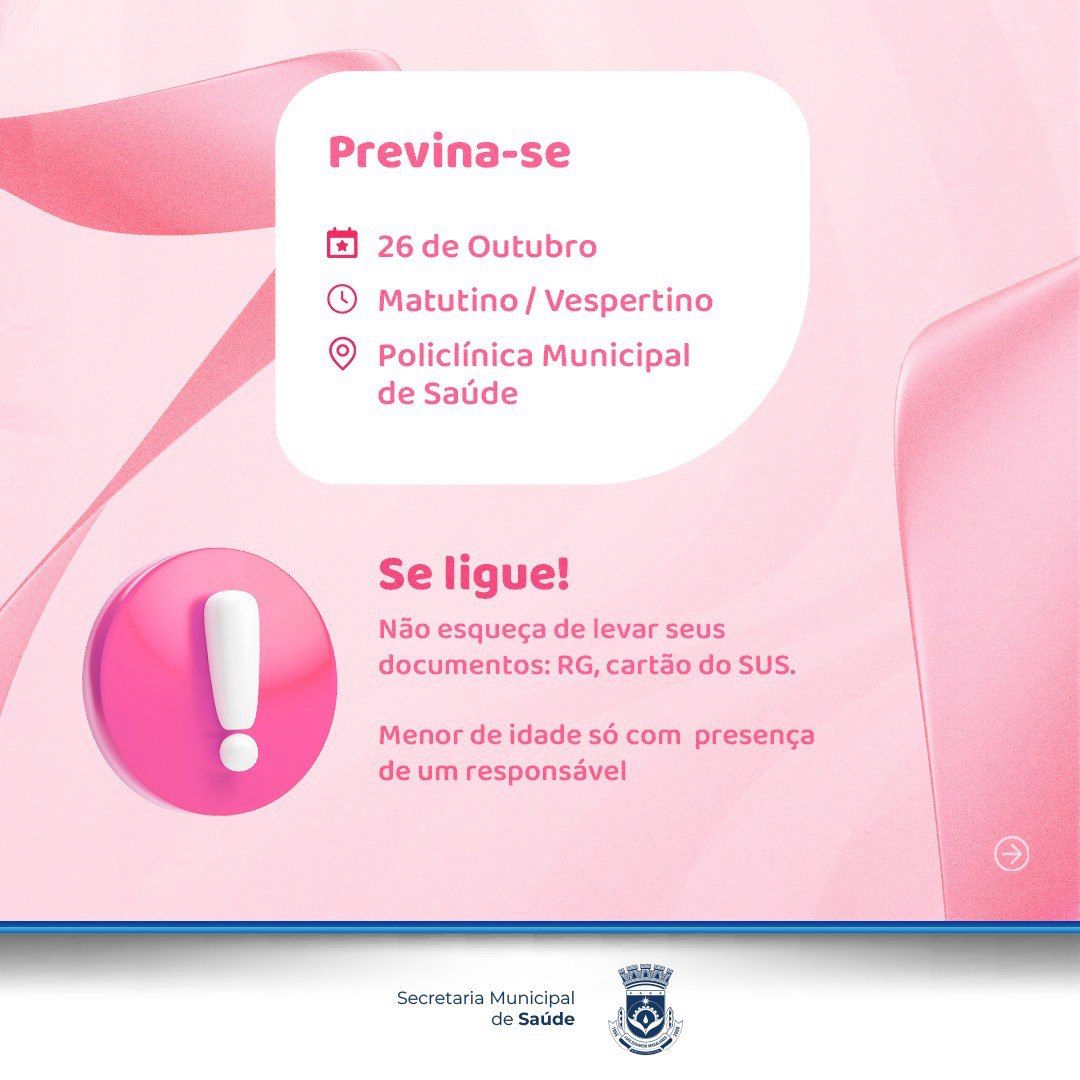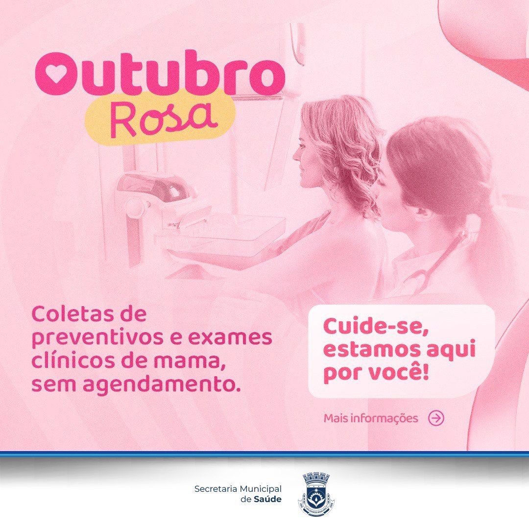 Em alusão ao Outubro Rosa, a Secretaria Municipal de Saúde de Luís Eduardo Magalhães, realiza no sábado, dia 26 de outubro, na Policlínica Municipal do bairro Santa Cruz, um dia inteiro dedicado à saúde das mulheres, com a coleta de preventivo e o exame clínico das mamas.