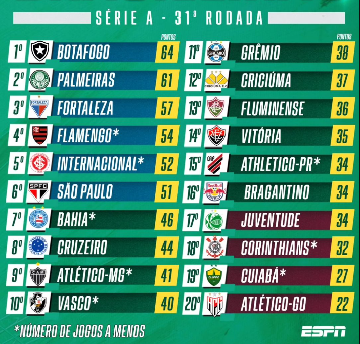 Entre os destaques da rodada, o triunfo do Vitória, que agora está um ponto acima do melhor colocado na Z-4, o Juventude. Amanhã, segunda, 28, ainda se enfrentam Cuiabá X Corinthians, no sufoco da Z-4 e Vasco X Bahia, em São Januário, lutando pela classificação à Copa Sulamericana.