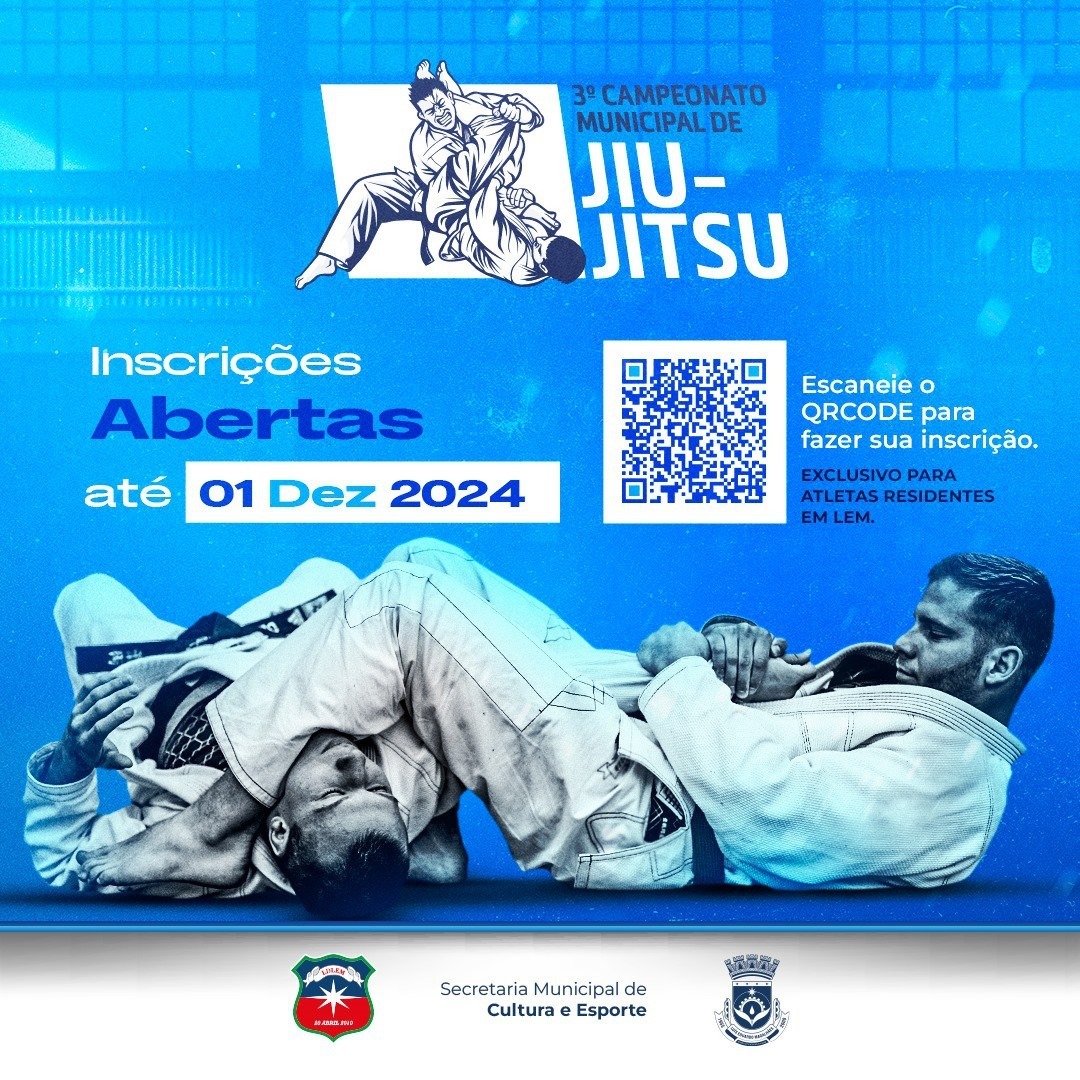 Atletas de Luís Eduardo Magalhães têm até o dia 1º de dezembro para realizarem a sua inscrição no terceiro Campeonato Municipal de Jiu-Jitsu, disponível por meio do link (https://encurtador.com.br/OJcic) ou da leitura do QR code.