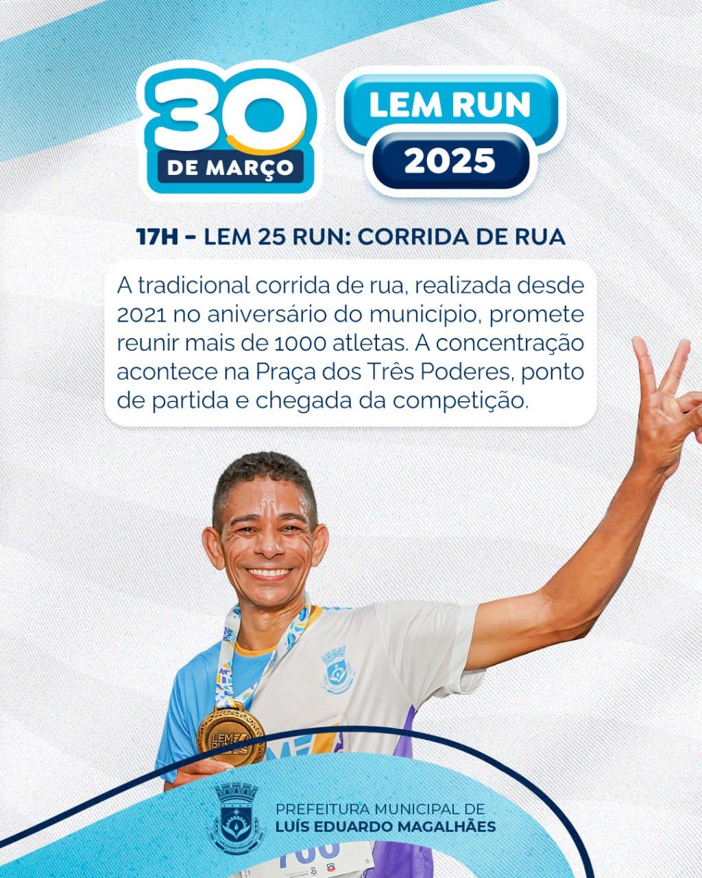 A tradicional corrida de rua, realizada desde 2021 no aniversário do município, promete reunir mais de 1000 atletas. A concentração acontece na Praça dos Três Poderes, ponto de partida e chegada da competição.