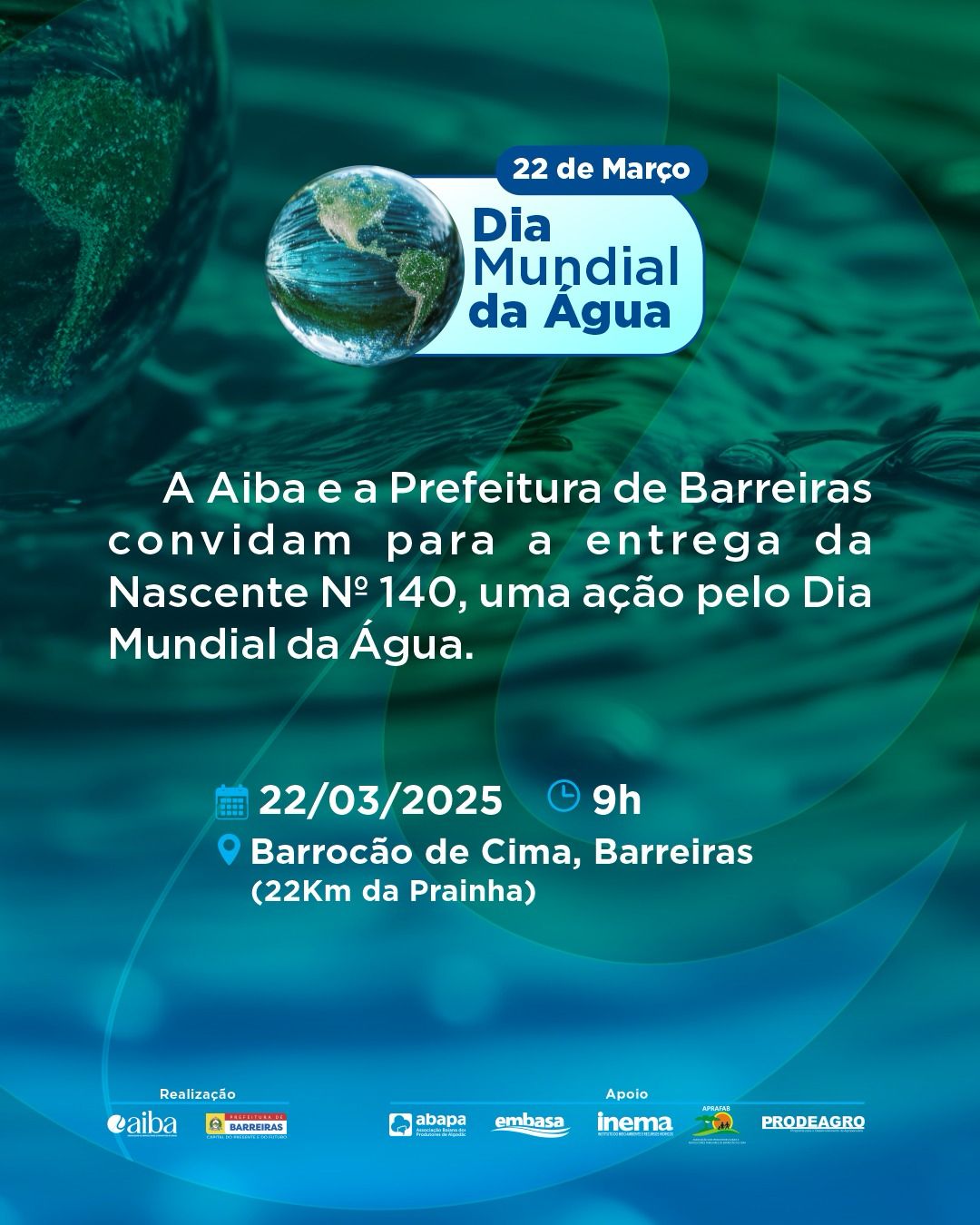 Em celebração ao Dia Mundial da Água, neste sábado, 22 de março, a Associação de Agricultores e Irrigantes da Bahia (Aiba) e a Prefeitura de Barreiras realizarão a entrega da 140ª nascente recuperada pelo Projeto Nascentes do Oeste. O evento acontece às 9h, na comunidade de Barrocão de Cima, em Barreiras.