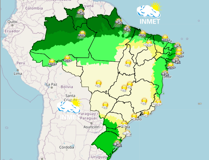 Há alertas de perigo potencial, perigo e grande perigo relacionado à chuva para o Nordeste, segundo o Inmet (Instituto Nacional de Meteorologia).