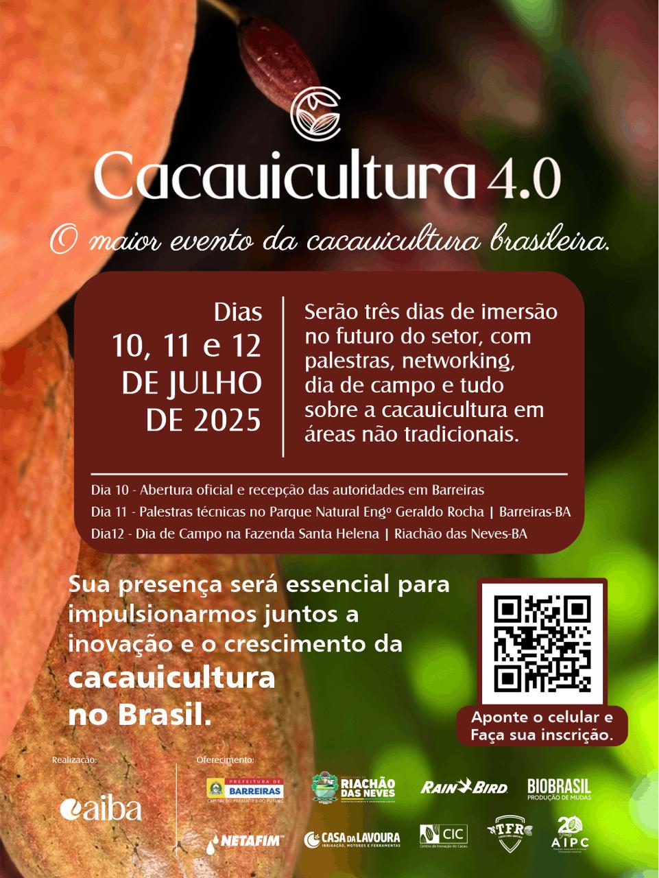 A cacauicultura brasileira tem um encontro marcado com o futuro. Entre os dias 10 e 12 de julho de 2025, os municípios de Barreiras e Riachão das Neves, no oeste da Bahia, sediarão a próxima edição do Cacauicultura 4.0, maior evento técnico e institucional do setor no Brasil. Realizado pela Associação de Agricultores e Irrigantes da Bahia (Aiba), o encontro deve reunir produtores, pesquisadores, técnicos, investidores e especialistas de todo o país e também do exterior, para discutir os caminhos da cacauicultura moderna, com ênfase em tecnologia, inovação e sustentabilidade.