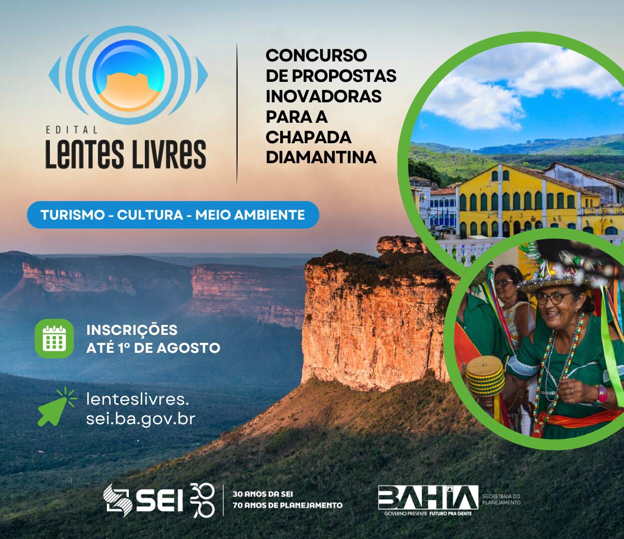 Moradores de 45 municípios da Chapada Diamantina poderão concorrer a prêmios em dinheiro com propostas criativas voltadas ao fortalecimento do turismo, da cultura e do meio ambiente da região. O edital do concurso Lentes Livres foi publicado pelo Governo do Estado, por meio da Superintendência de Estudos Econômicos e Sociais da Bahia (SEI), e está disponível no site lenteslivres.sei.ba.gov.br.