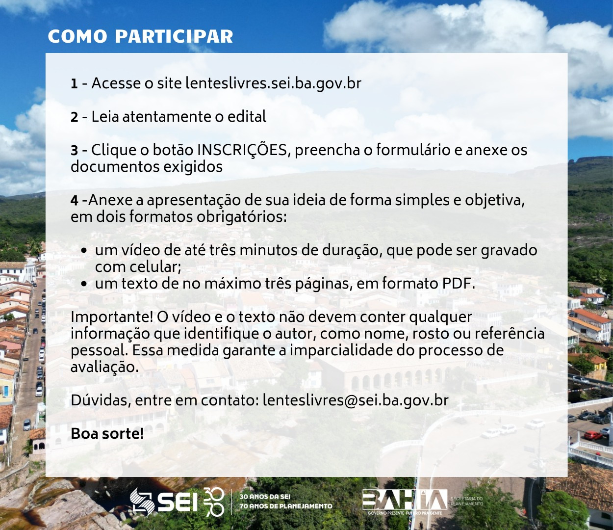 Mais informações e o edital completo estão disponíveis no site: lenteslivres.sei.ba.gov.br.