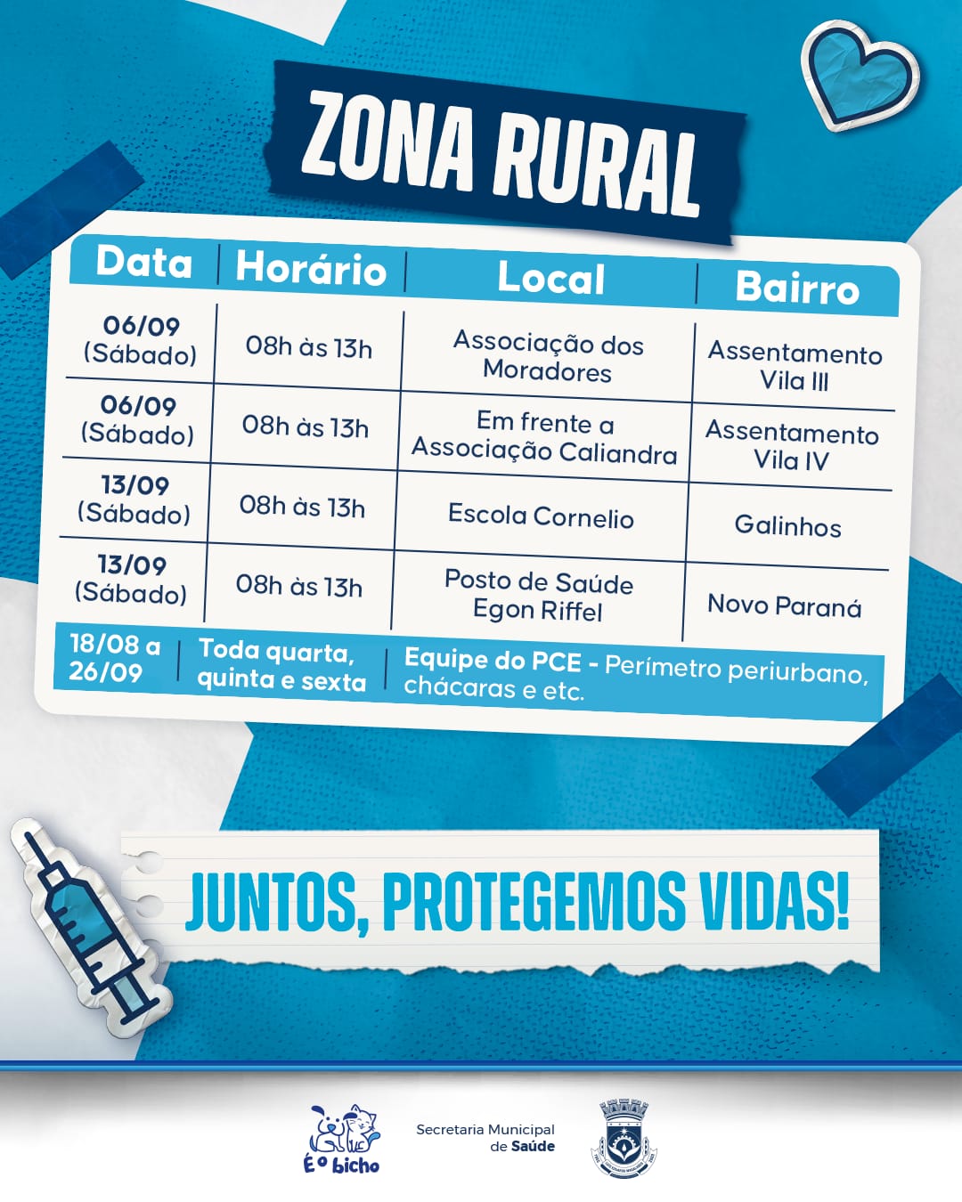 Dias 18/08 a 26/09 (quartas, quintas e sextas) – Perímetro periurbano, chácaras e demais localidades.