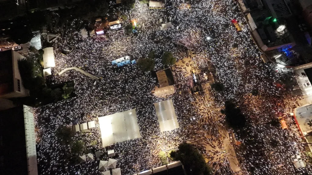 “Tragam todos para casa! Parem a guerra!”, gritava a vasta multidão, que convergiu para a chamada Praça dos Reféns, em Tel Aviv. O Fórum de Reféns e Famílias Desaparecidas, que convocou o protesto, estimou que cerca de 500 mil pessoas aderiram à manifestação em Tel Aviv, número não confirmado pela polícia.