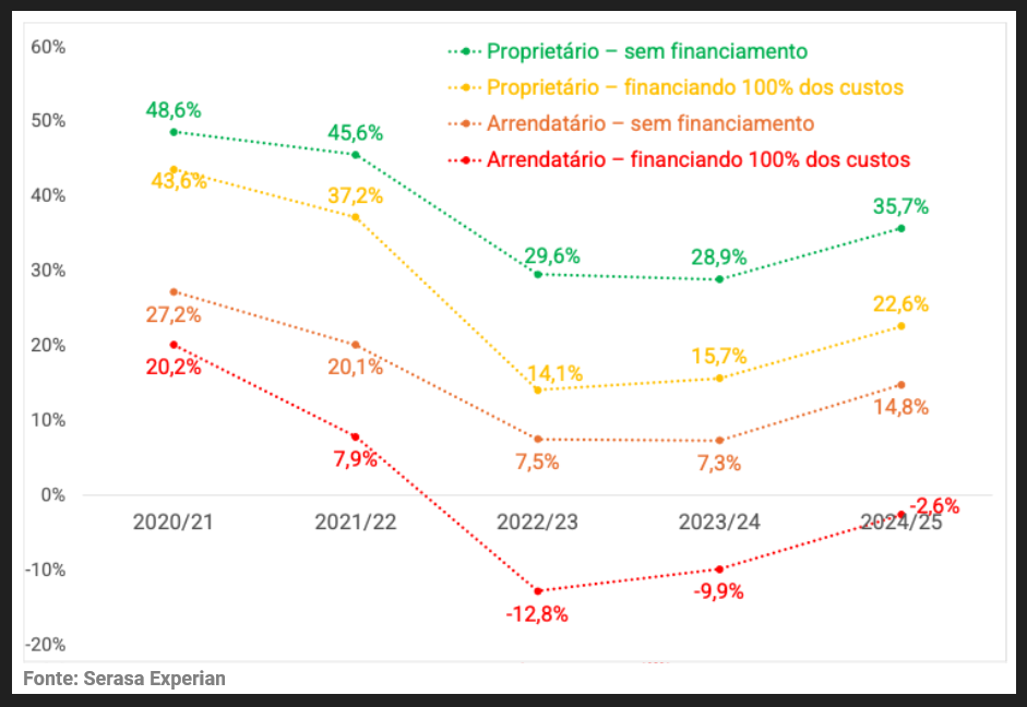 Frente às últimas cinco safras, o ciclo 2021/22 marcou o auge de rentabilidade para o produtor, com receita média de R$ 8.465,03 por hectare, impulsionada pelo preço da saca acima de R$ 150 e, em alguns casos, ultrapassando R$ 175. Porém, a produtividade caiu 7% devido a condições climáticas adversas. Nos anos seguintes, a realidade mudou: em 2023/24, a receita por hectare caiu 15% em relação ao pico de R$ 8.465,03 registrado em 2021/22, chegando a R$ 6.922,12, acompanhada de queda de 3% na produtividade. Os custos também pesaram. Fertilizantes e defensivos subiram fortemente entre 2021 e 2022, pressionados pela pandemia e pela guerra na Ucrânia. O custo por hectare atingiu o pico em 2022/23: R$ 5.713,62 para produtores com terras próprias e R$ 7.505,49 para arrendatários. Mesmo com uma leve queda posterior, os patamares seguem elevados. Esse descompasso impactou diretamente a rentabilidade. No caso do produtor proprietário, a margem média que era de 48,6% em 2020/21 caiu para 29,6% em 2022/23, e recuperou um pouco para 35,7% em 2024/25. Para o arrendatário, a situação foi mais crítica: de 27,2% em 2020/21 para apenas 7,3% em 2023/24, com recuperação parcial para 14,8% em 2024/25. Cenários com financiamento total dos custos no mercado de crédito ampliam ainda mais essa pressão, reduzindo as margens a níveis mínimos. “O agronegócio brasileiro é referência mundial em produtividade, mas para manter a competitividade global, é essencial que a governança de risco acompanhe esse nível de excelência. Hoje, já temos recursos de análise muito mais precisos e acessíveis do que há poucos anos, o que permite apoiar o produtor em momentos de maior volatilidade e proteger o sistema de crédito como um todo”, diz Marcelo Pimenta, head de Agro da Serasa Experian. Gestão de risco como diferencial competitivo De acordo com os especialistas da Serasa Experian, a sustentabilidade financeira do agronegócio depende cada vez mais de governança de crédito robusta e análise de dados de alta precisão. Hoje, é possível combinar diferentes dimensões de risco – histórico de pagamentos, capacidade produtiva, resiliência climática, compliance ESG e projeções de preços – para antecipar riscos e renegociar contratos quando necessário. Recursos como o cadastro positivo, a regulação das Cédulas de Produto Rural (CPRs) e o sensoriamento remoto reduziram custos de monitoramento e trouxeram mais transparência às operações. Com tecnologia proprietária e inteligência analítica, a Serasa Experian afirma estar transformando a forma de avaliar e acompanhar o risco de produtores rurais durante todo o período de financiamento, protegendo tanto o produtor quanto os credores e investidores em direitos creditórios. “produzir segue sendo essencial, mas a disciplina em gerir será o fator decisivo para garantir sustentabilidade e competitividade no futuro do agronegócio brasileiro”, finaliza Marcelo Pimenta, head de agronegócio da Serasa Experian. |