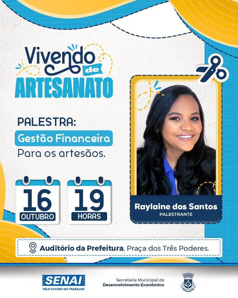 A Secretaria de Desenvolvimento Econômico realizará na quinta-feira, dia 16 de outubro, a partir das 19h, a palestra “Gestão Financeira”, voltada para artesãos do município. O evento acontecerá no Auditório da Prefeitura Municipal e terá até 50 participantes.