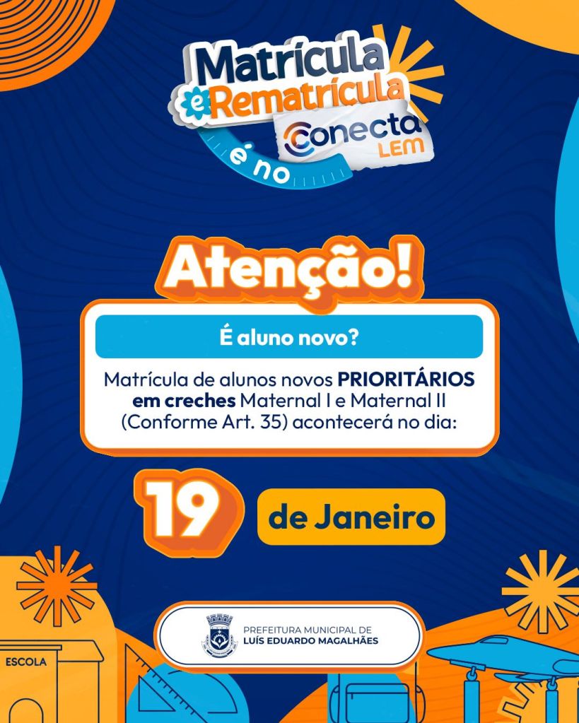 A Prefeitura de Luís Eduardo Magalhães, por meio da Secretaria Municipal de Educação, inicia no dia 19 de janeiro o período de matrícula para novos alunos da Rede Pública Municipal de Ensino.