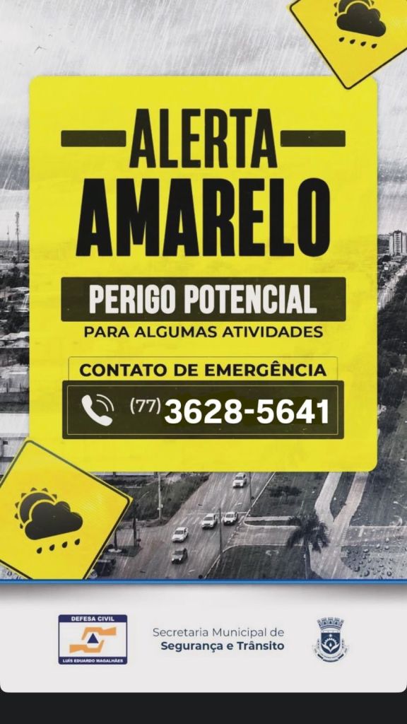 A Defesa Civil de Luís Eduardo Magalhães divulga novo boletim com Alerta Amarelo para chuvas intensas nos próximos dias. O alerta tem início às 00h01 do dia 12 de fevereiro de 2026 e segue até às 23h59 do dia 13 de fevereiro de 2026 baseado nas informações do Instituto Nacional de Meteorologia (INMET).