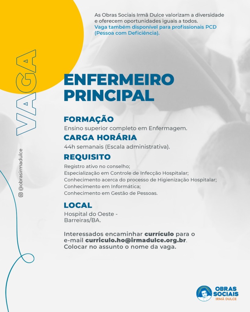 Hospital do Oeste está contratando enfermeiro principal