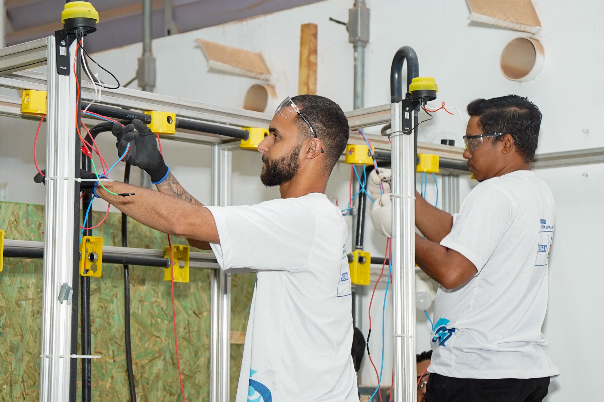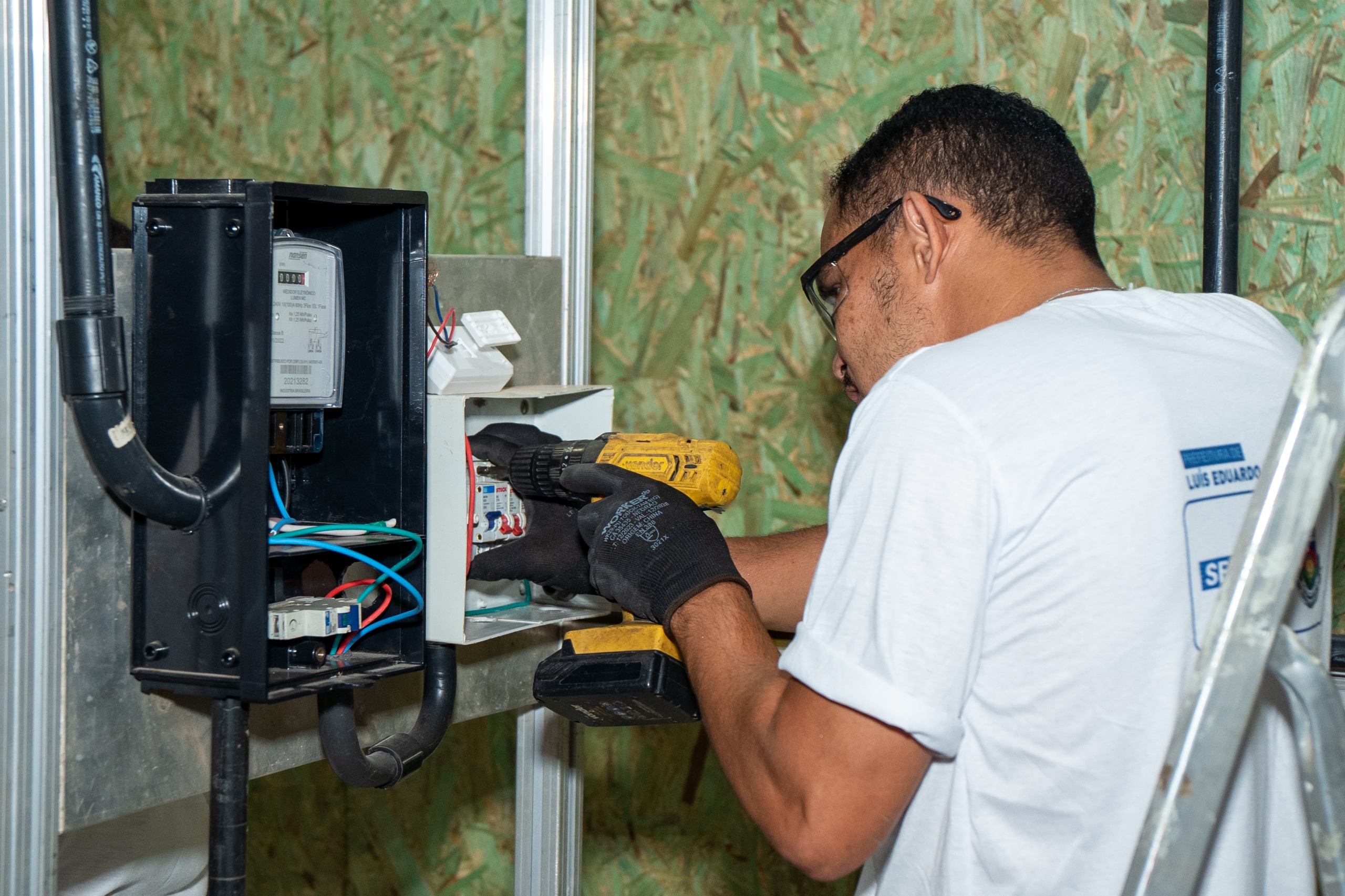 Após concluírem a fase teórica, os 20 alunos do curso de Eletricista de Instalações Prediais do Qualifica LEM iniciaram a etapa de aulas práticas. Sob a orientação do professor Max Oliveira, eles estão aprendendo a montagem e instalação de componentes como disjuntores, interruptores, campainha, dimmer, sensor de presença, luminárias, entre outros.