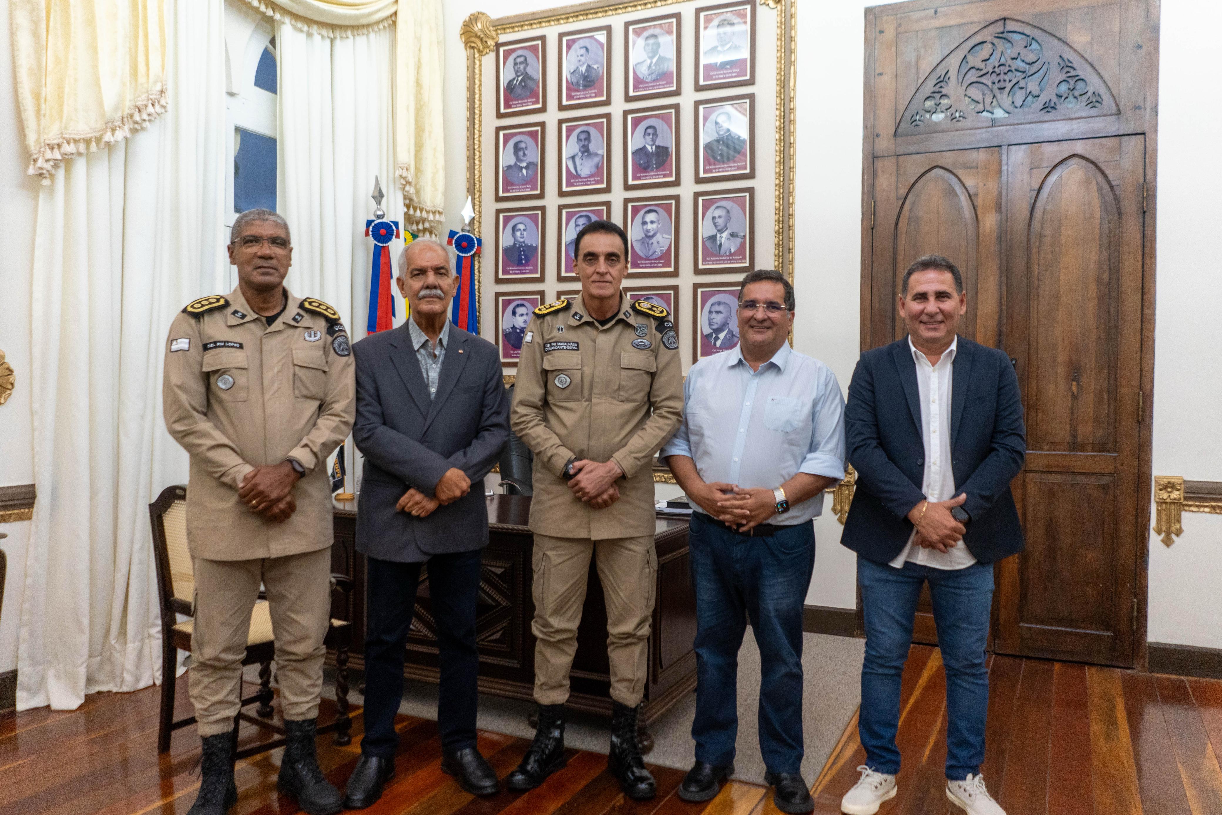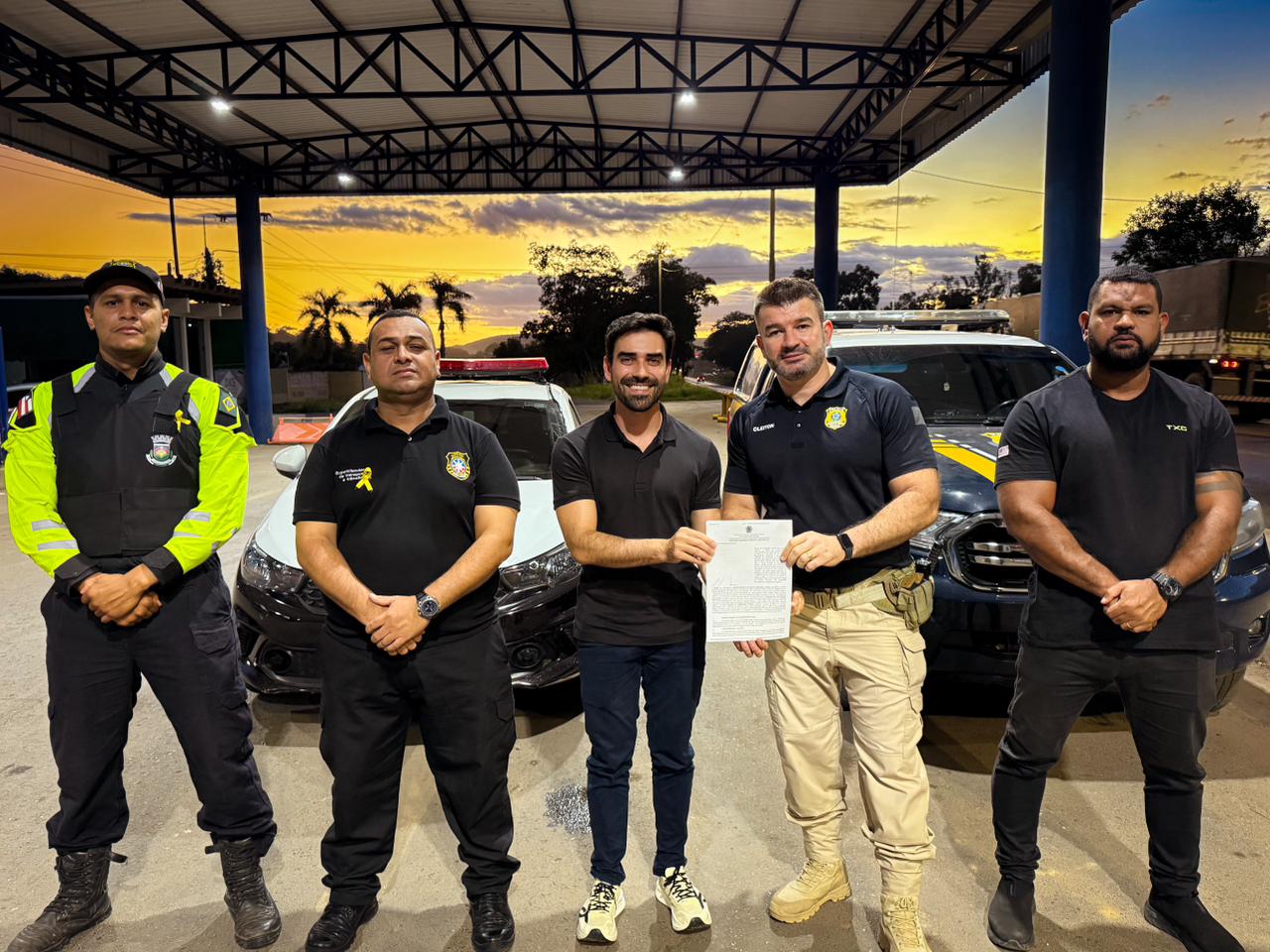 O coordenador Operacional da Sutrans, Mateus Oliveira; o superintendente da Sutrans, Adriano Silva; o prefeito de Luís Eduardo Magalhães, Junior Marabá; o inspetor Chefe da Delegacia 10/10 PRF, Cleiton Corrêa e o secretário de Segurança e Trânsito de LEM, João Paulo Nascimento.
