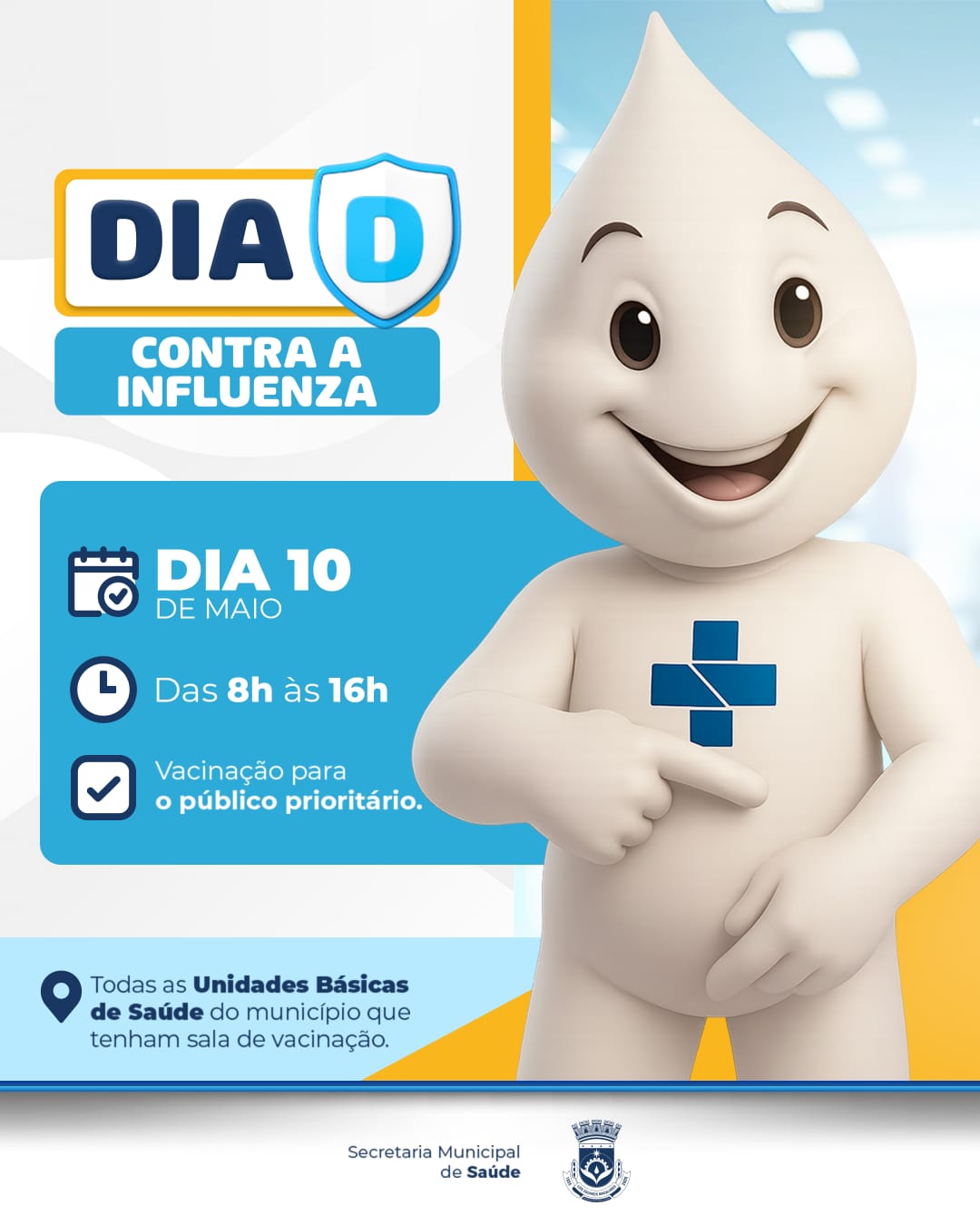 A Prefeitura de Luís Eduardo Magalhães, por meio da Secretaria Municipal de Saúde, promove amanhã 10 de maio, o Dia D da Campanha de Vacinação contra a Influenza. A ação acontecerá das 8h às 16h, nas 15 salas de vacinação do município.