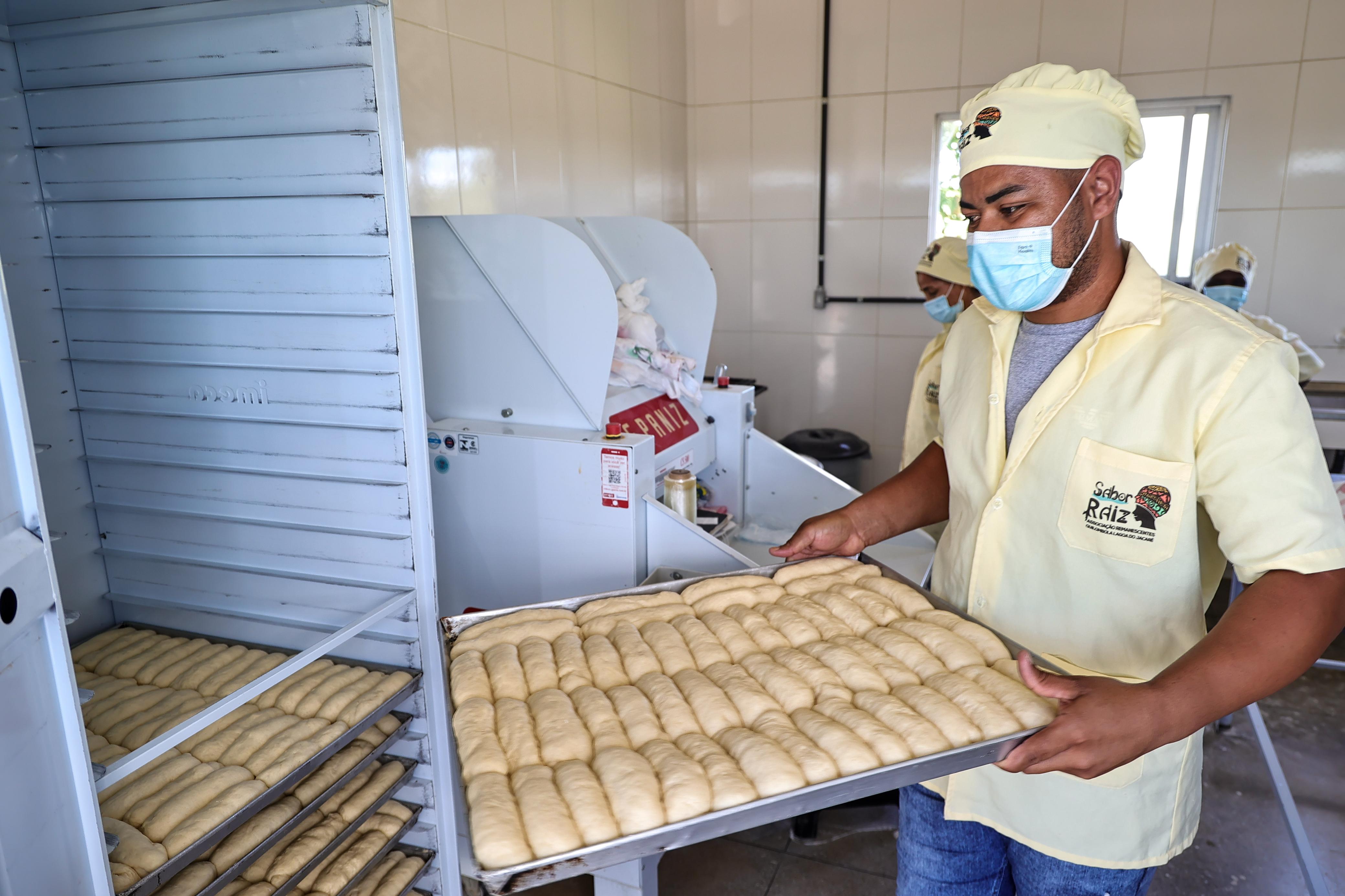 Enquanto finalizava a massa do pão, Calebe Santana, coordenador de produção da Sabor Raiz, compartilhou um pouco de sua trajetória, revelando que o gosto pela produção de alimentos vem de família. “Minha avó era uma doceira famosa. Ela ensinou minha mãe e eu herdei essa habilidade de fazer os produtos. Fora daqui da unidade, também sou confeiteiro e produzo doces”, contou.