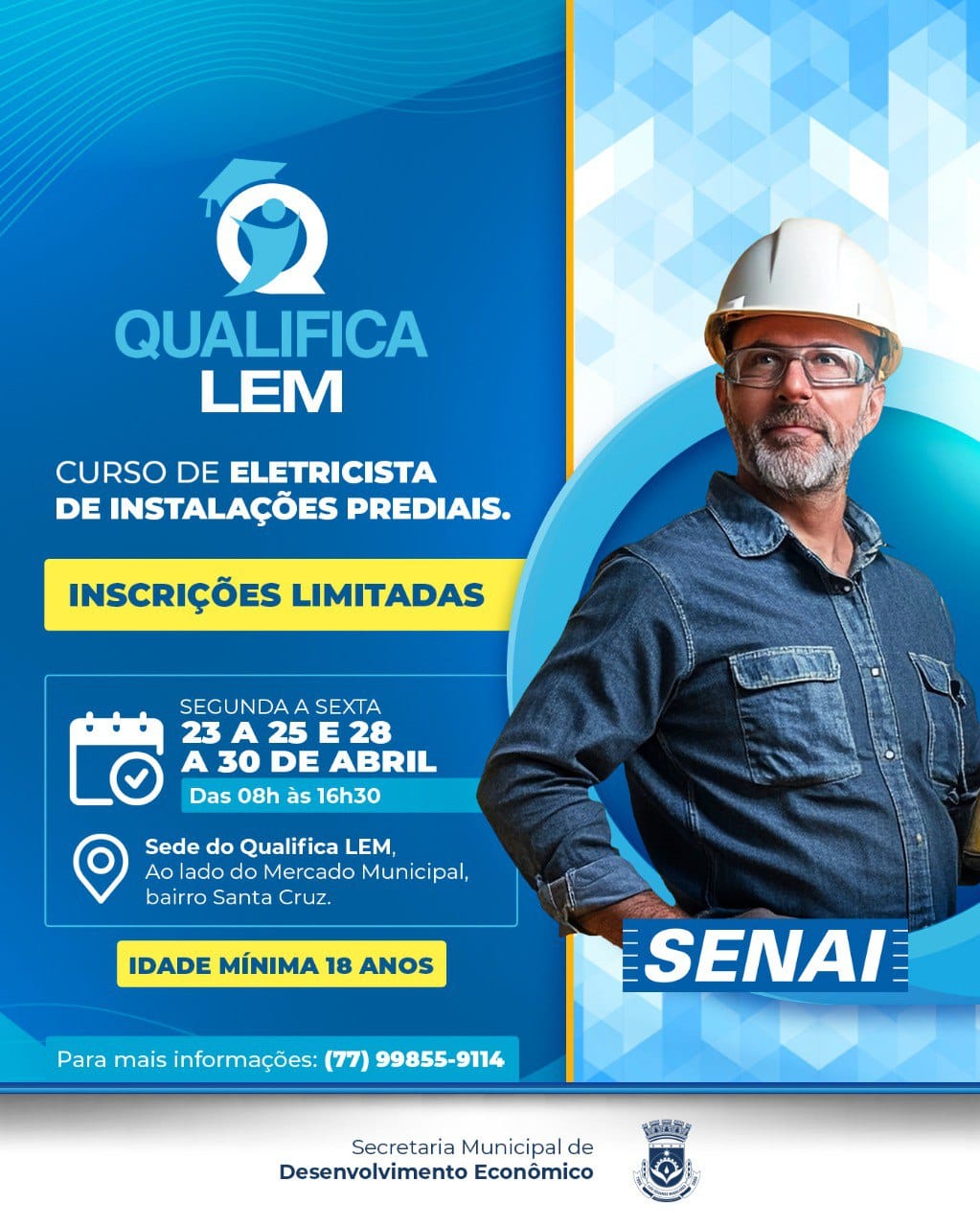 A Prefeitura de Luís Eduardo Magalhães anuncia a abertura das inscrições para os curso gratuitos de Eletricista de Instalações Prediais e Instalação Hidráulica Predial . As inscrições seguem até o dia 30 de abril ou enquanto houver vagas. A iniciativa faz parte do Programa Qualifica LEM, uma parceria entre a Secretaria Municipal de Desenvolvimento Econômico e o Senai.