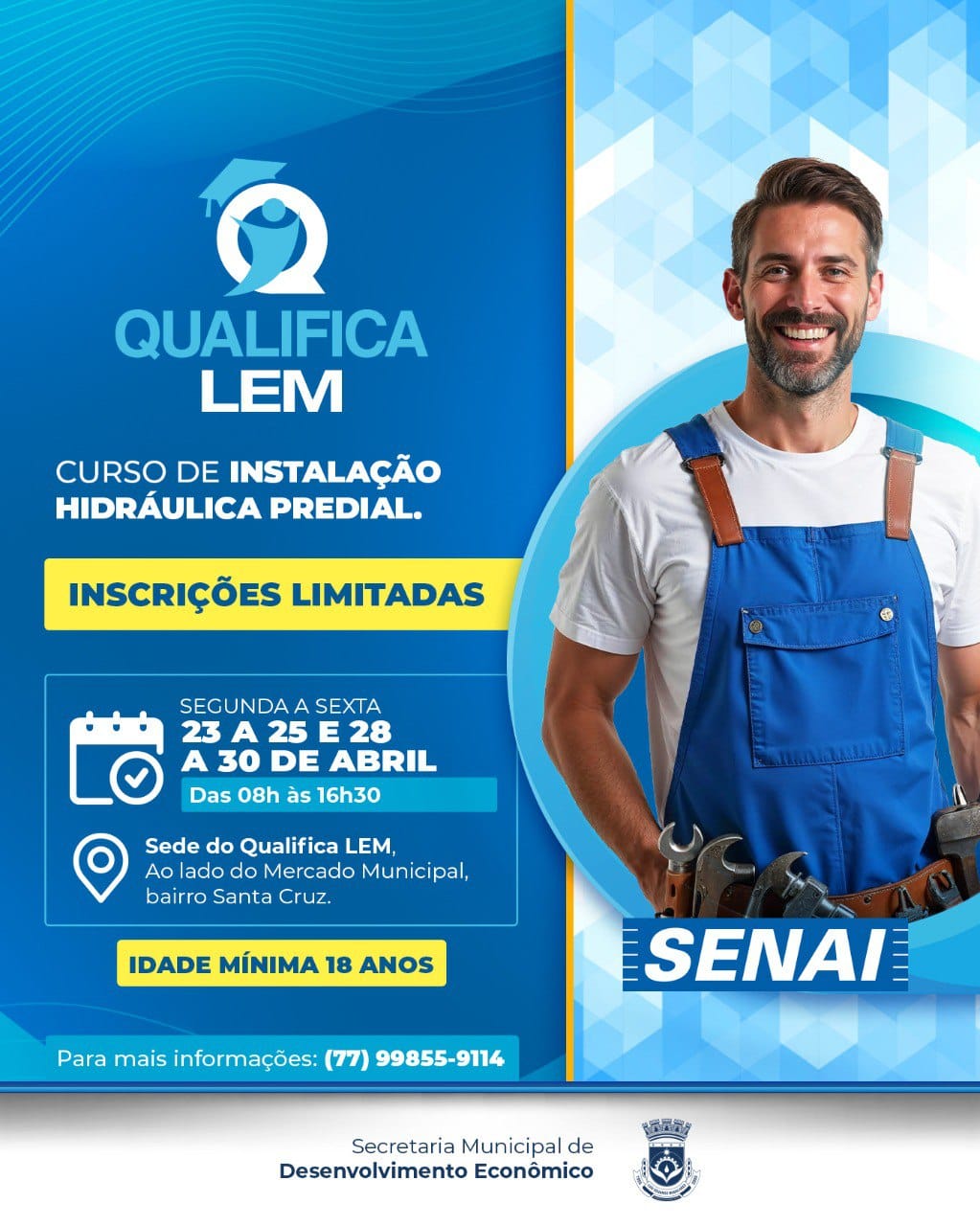 A Prefeitura de Luís Eduardo Magalhães anuncia a abertura das inscrições para os curso gratuitos de Eletricista de Instalações Prediais e Instalação Hidráulica Predial . As inscrições seguem até o dia 30 de abril ou enquanto houver vagas. A iniciativa faz parte do Programa Qualifica LEM, uma parceria entre a Secretaria Municipal de Desenvolvimento Econômico e o Senai.