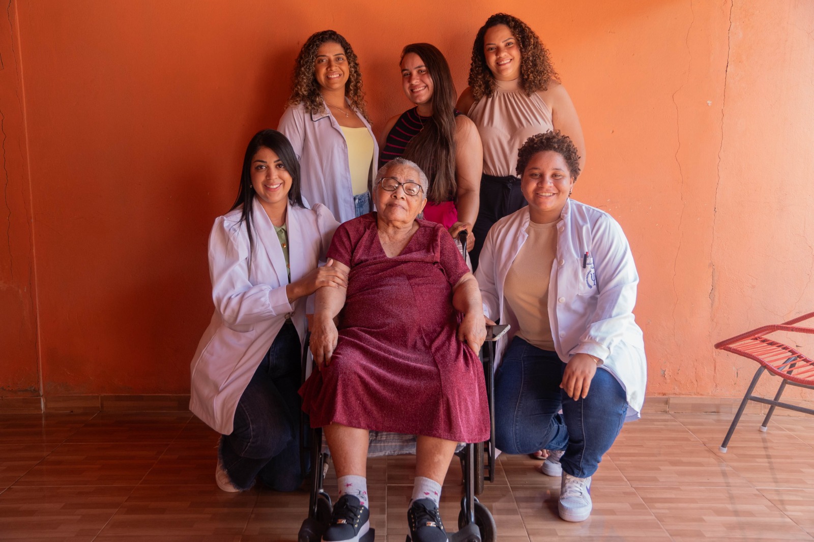 Bruna Nascimento (Fisioterapeuta), Tatiana Ramos (Nutricionista), Geovanna Radhija (estagiária de enfermagem), Silvia Corado (gerente de Média e Alta Complexidade), Thalia Nascimento (Psicóloga) e a dona Maria