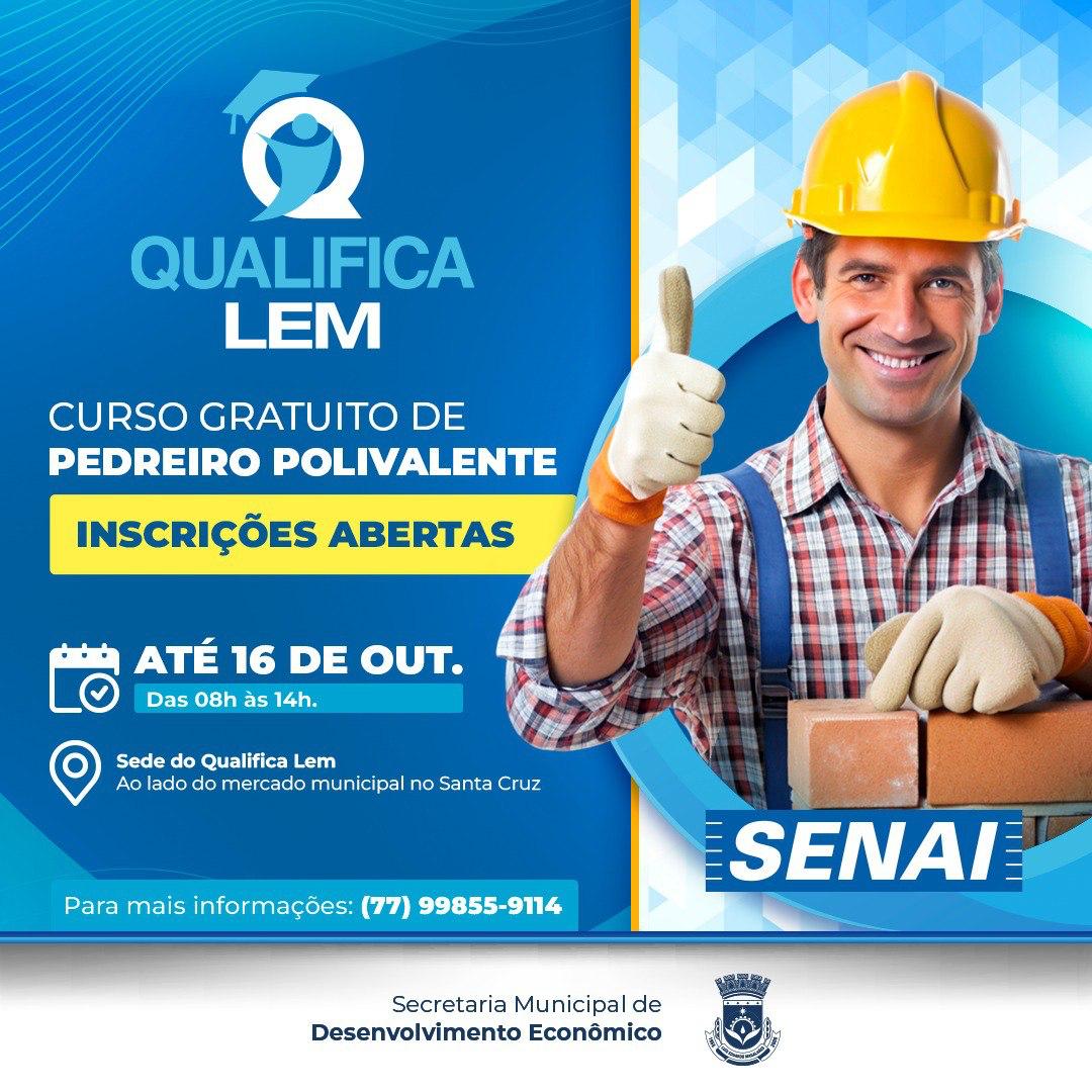 A Prefeitura de Luís Eduardo Magalhães, através da Secretaria Municipal de Desenvolvimento Econômico, por meio do Programa Qualifica LEM, está com inscrições abertas até o dia 16, para o curso de Pedreiro Polivalente. São ao todo 20 vagas, com carga horária de 160h.
