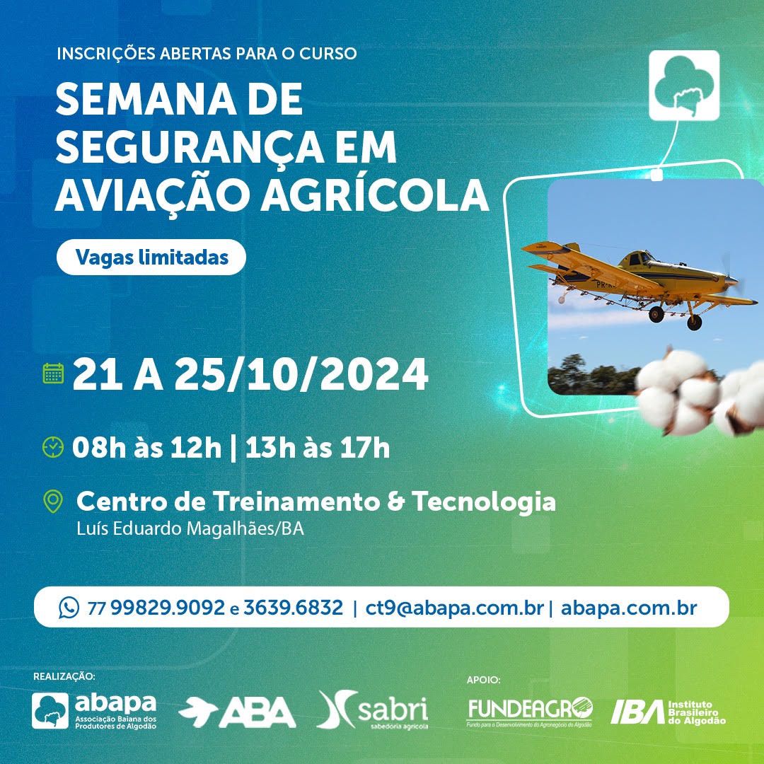 As vagas para a Semana de Segurança em Aviação Agrícola são limitadas. Para mais informações, os interessados podem entrar em contato pelos telefones (77) 99829-9092 / (77) 3639-6832 ou pelo e-mail ct9@abapa.com.br