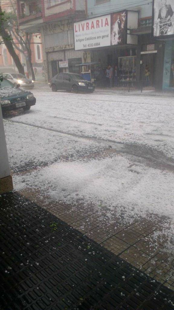 O relato e a foto são do repórter Luiz Carlos Nunes. Segundo ele, um fenômeno apavorante pelo tamanho das pedras, a intensidade e a duração da chuva de granizo. A chuva aconteceu agora próximo às 18 horas.