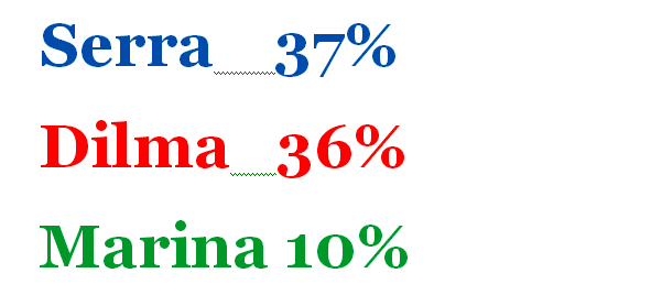 As candidaturas do PT mostraram-se arrasadoras neste início de campanha, conforme a consulta do Instituto Data Folha, com a candidata Dilma Rousseff (41%) colocando oito pontos sobre José Serra (33%). Também são expressivos os resultados das pesquisas no Rio Grande do Sul, Minas Gerais e Rio de Janeiro. Quando todos esperavam uma recuperação do candidato tucano, frente ao debate da Band e as entrevistas realizadas pela Rede Globo, o resultado foi inverso. Com margem de erro de 2%, numa simulação de segundo turno, Dilma tem 49% contra 41%, ficando a um ponto percentual de uma vitória no primeiro turno. Infográfico e informações do jornal Folha de São Paulo.