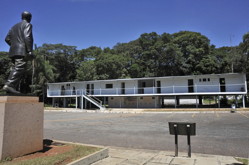 A estátua de Oscar Niemeyer em frente ao Catetinho, sua primeira obra em Brasília. Os pilotis já estavam nascendo como marca da futura Capital Federal.