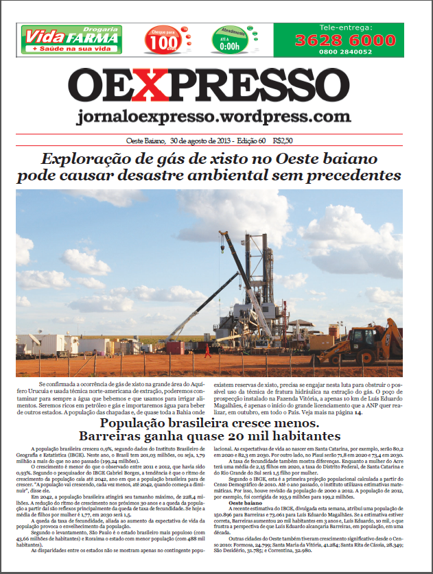 Dentro de no máximo meia hora, o leitor poderá inteirar-se da edição de O Expresso, que traz como matéria de capa uma dúvida que deve assolar todos os oestinos: estaremos ganhando com a descoberta de gás de xisto ou petróleo em nosso território ou estaremos à beira de um desastre ambiental sem precedentes, com a contaminação de nossa maior riqueza, o grande lago subterrâneo do aquífero Urucuia.