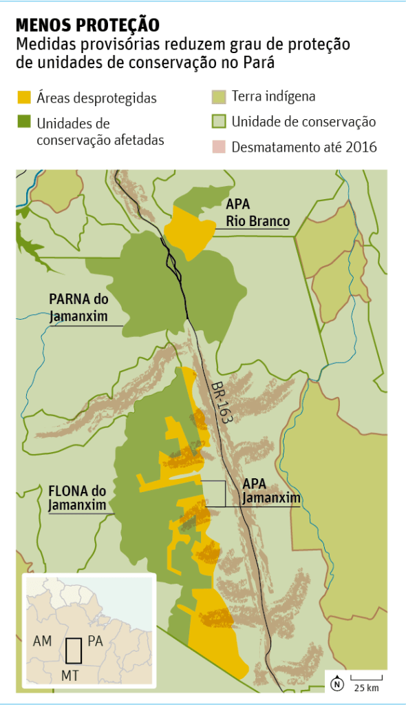 Todos esses casos serão passíveis de regularização caso o presidente Michel Temer sancione a medida provisória (MP) 756. Aprovada com alterações pelo Congresso no mês passado, prevê a redução na proteção de 486 mil hectares da Flona do Jamanxim -37% do total.