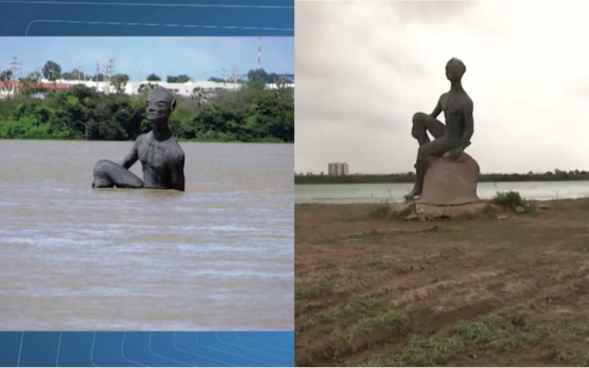 Em Juazeiro, uma imagem emblemática da situação do rio. Uma estátua do Negro D’Água, submersa sob as águas das barragens a montante de Sobradinho, apareceu novamente em uma ilha de areia. Imagem da TV São Francisco.
