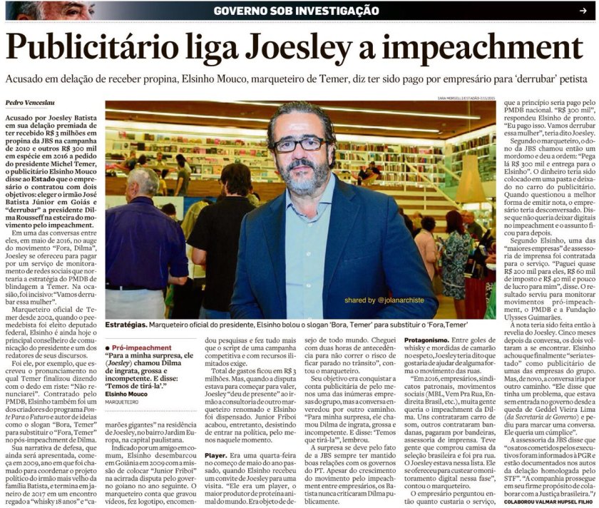 Acusado por Joesley Batista em sua delação premiada de ter recebido R$ 3 milhões em propina da JBS na campanha de 2010 e outros R$ 300 mil em espécie em 2016 a pedido do presidente Michel Temer, o publicitário Elsinho Mouco disse ao Estado que o empresário o contratou com dois objetivos: eleger o irmão José Batista Júnior em Goiás e “derrubar” a presidente Dilma Rousseff na esteira do movimento pelo impeachment.