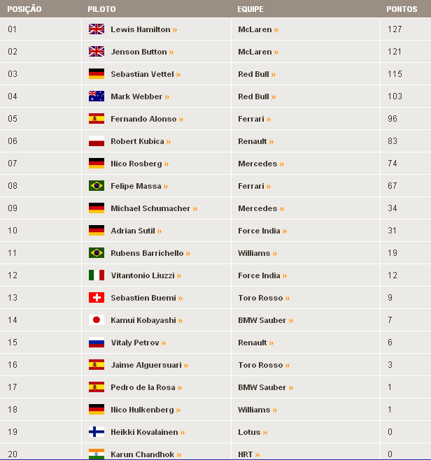A classificação do Mundial de F1, após o GP da Europa – Valência. Infográficos criados pelo site Terra, onde poderá ser lida a cobertura completa do evento: