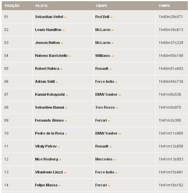 Webber, Vettel e Hamilton: entre os três primeiros colocados deverá estar o vencedor do GP de Valência. No “bafo”, Alonso, em casa, e Massa, de contrato novo, esperam chegar também no pódio. Um pouco de F1 em meio a tanto jogo medíocre da Copa do Mundo, inclusos aí chutões e caneladas, não faz mal a ninguém. Amanhã, 9 horas, na Globo. Barrichello larga em nono. Mas o melhor de tudo é ver Schumacher largar lá no 15º e sofrer como um principiante. Está pagando pelos seus dias de arrogância e soberba. Bruno Senna está salvando a alma do tio, largando na última colocação.