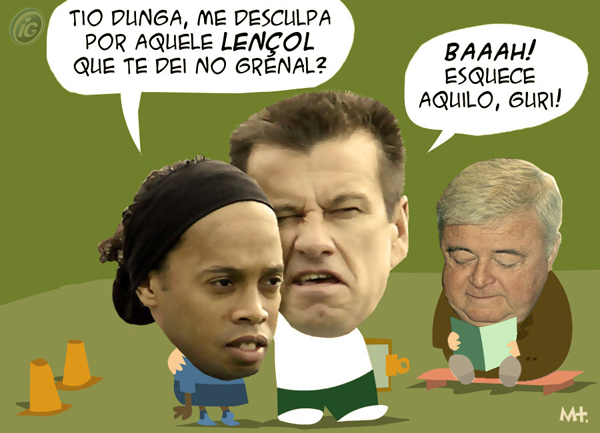 Parece que o Dunga (não seria Zangado?) não gosta mesmo de anatídeos (pato e ganso), nem de espécimes do gênero obesus cheirantis morbidus, como Adriano, Ronaldão e Roberto Carlos. Agora, quem está chateado mesmo é o Ronaldinho, que resolveu, num grenal, dar dois lençóis no Dunga. Hoje, Dunga retrucou com mais um, de uma série. Quem mandou ser firuleiro!