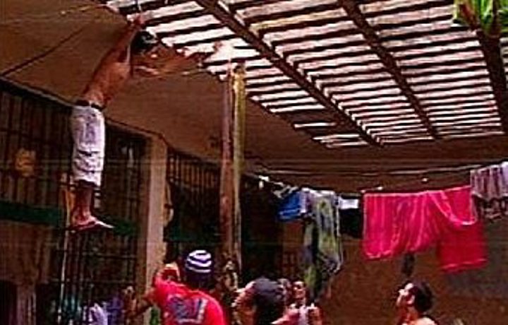 Os presos que ficaram mostram o buraco aberto no teto do pátio da cadeia por onde fugiram os 60 presos. Foto: reprodução da TV Bahia.